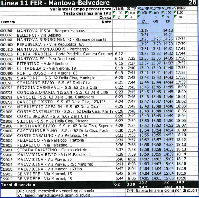 Le corse della linea 11 con partenza alle 13:25 (lun-mar-gio), 14:25 (mer-ven) dirette a Belvedere, partiranno dal capolinea di BORGOCHIESANUOVA, rispettivemente alle 13:18 e alle 14:18, transitando poi per BELLONCI e mantenendo gli stessi orari sulle fermate successive.
